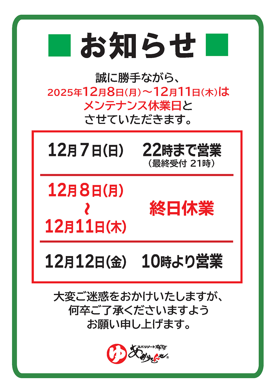 2022/11/01 お知らせ キャッシュレス決済お取り扱い終了のお知らせ いつもご利用いただきまして誠にありがとうございます。 「スパリゾート雄琴あがりゃんせ」と「天然源泉の宿ことゆう」では、11月15日(火…
