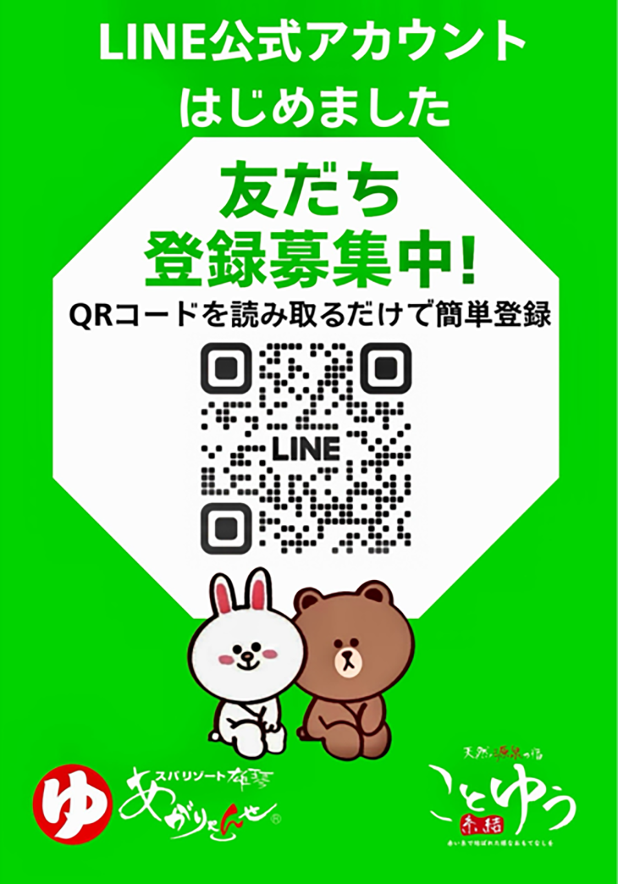 公式LINE始めました。友だち登録いただくとお得なクーポンプレゼント!「スパリゾート雄琴あがりゃんせ」「天然源泉の宿ことゆう」の情報をお届けします。